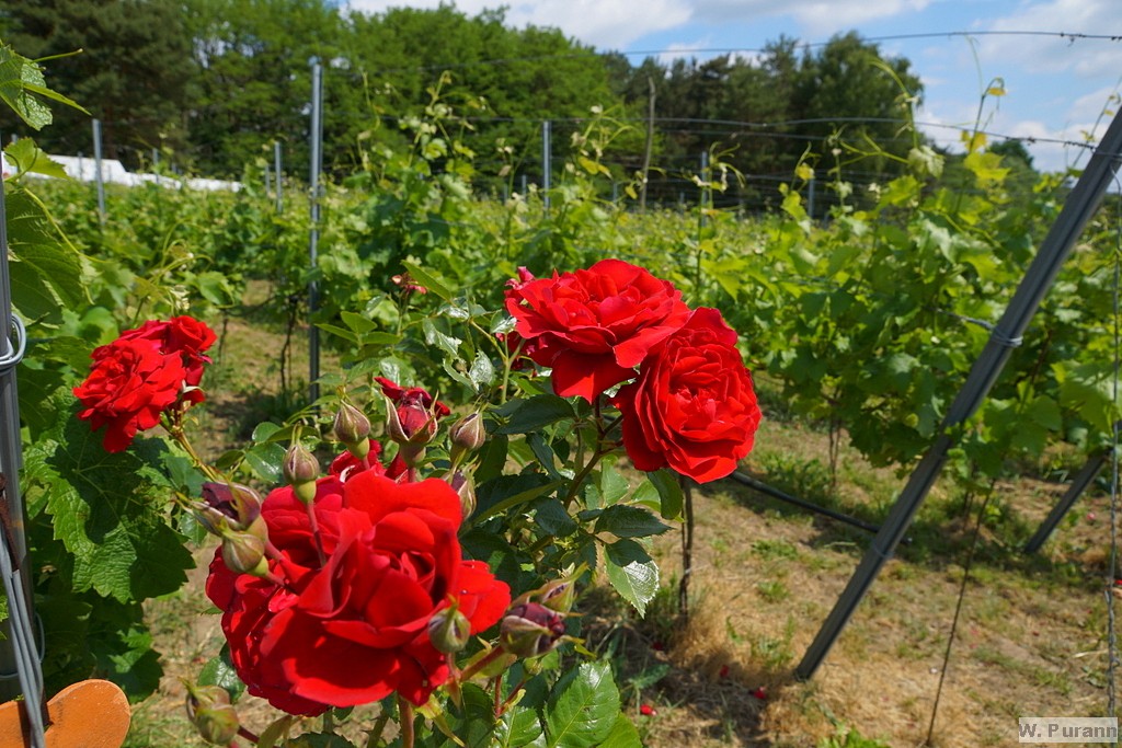 leuchtenden Rosen, die vor den Rebenreihen für die Liebste gepflanzt