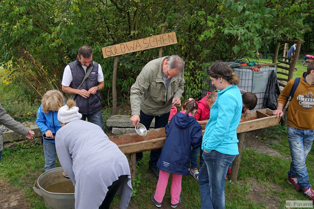 Kinder im Sandkasten spielen konnten, die größeren Gold waschen,