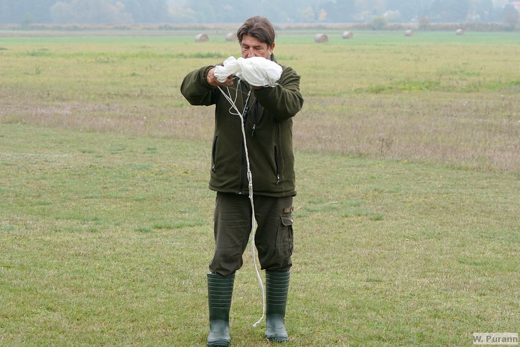 Jetzt hängt eine an einem kleinen Fallschirm befestigte Beute, die über