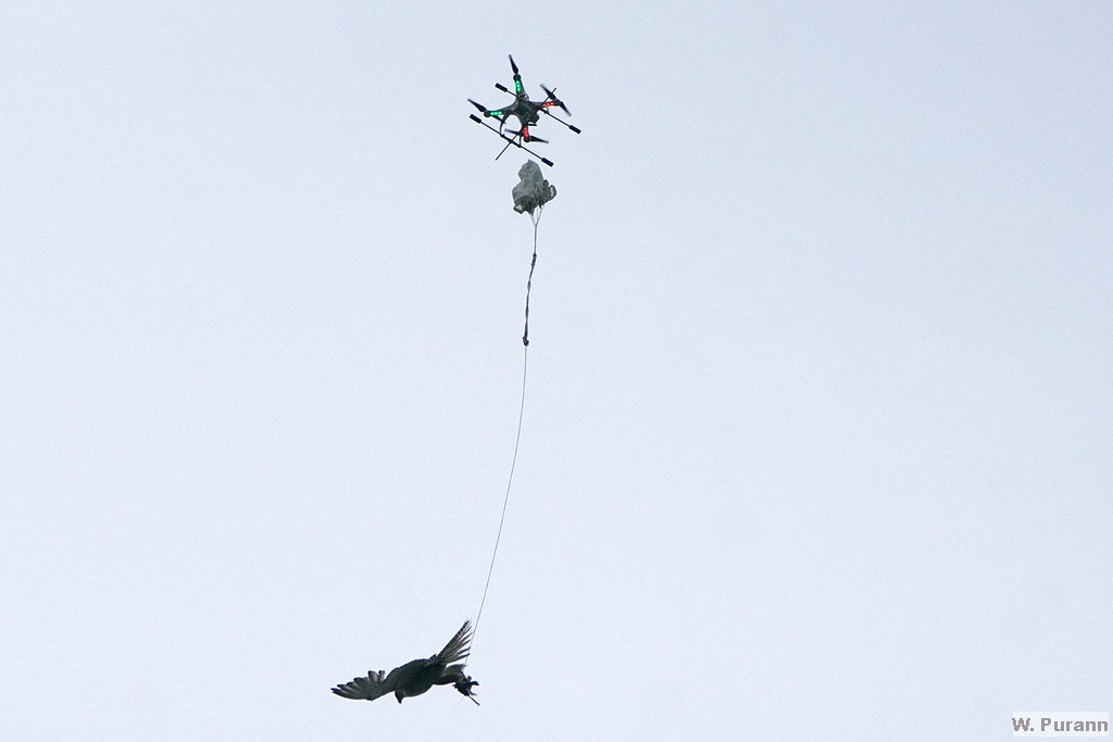 greifen. Hat er sie gepackt, löst sich der Fallschirm von der Drohne