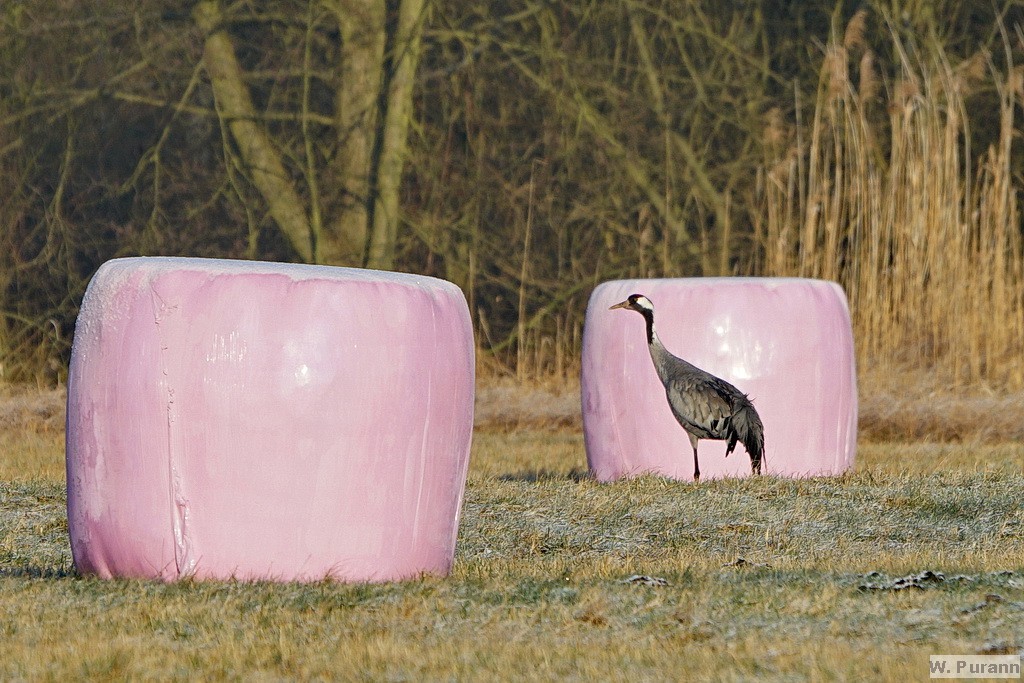 lagerten zahlreiche Heuballen, und an einem wanderte ein Kranich vorüber. Fast