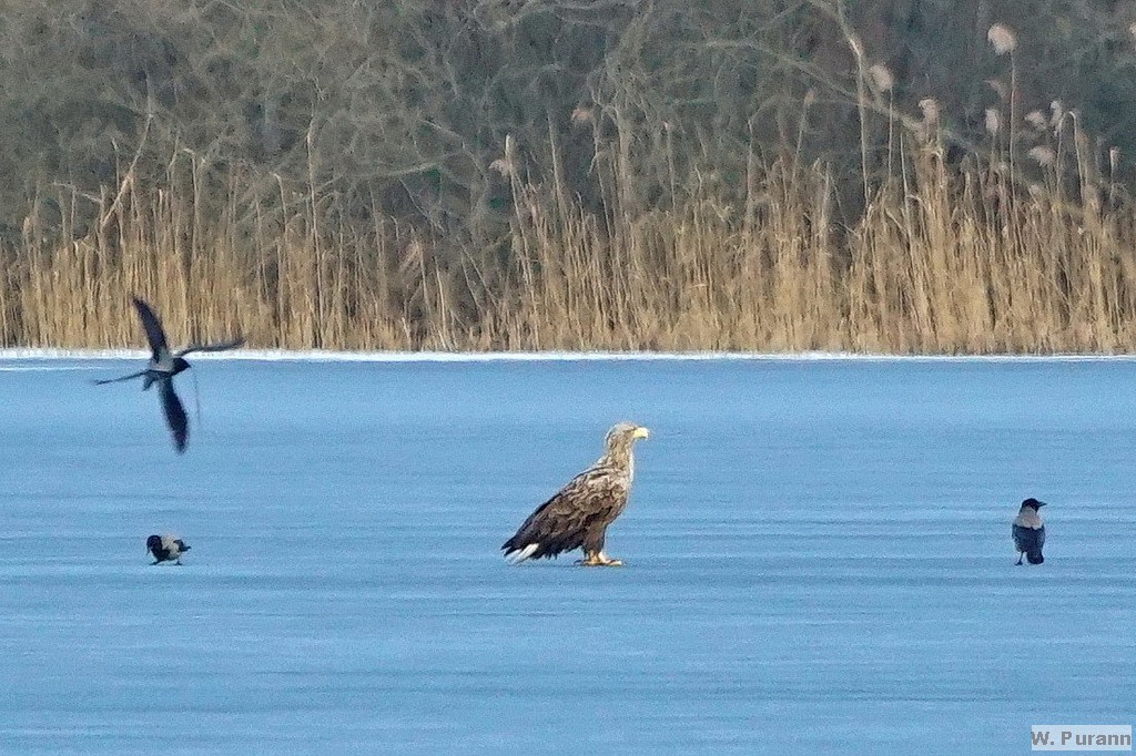 Vordersee, auf dessen Eis ein selten anzutreffender Seeadler neben Krähen