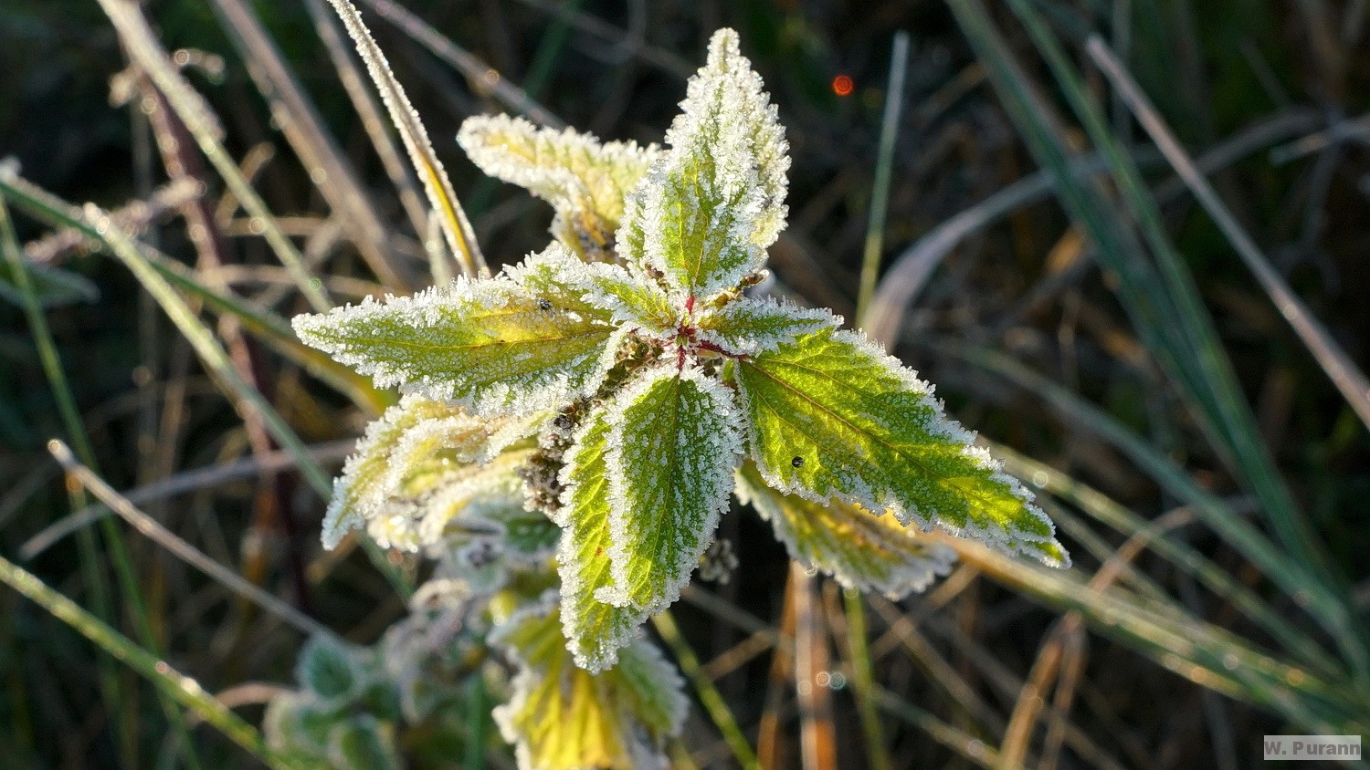 Bodenfrost. Das reizte, um die mit Eiskristallen überzogene Natur zu