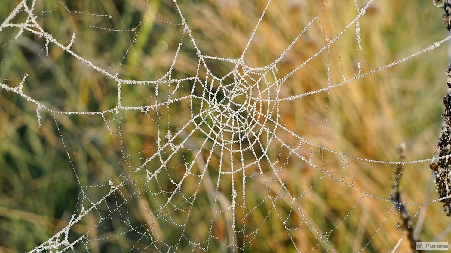 Spinnweben mit Eiskristallen verziert.