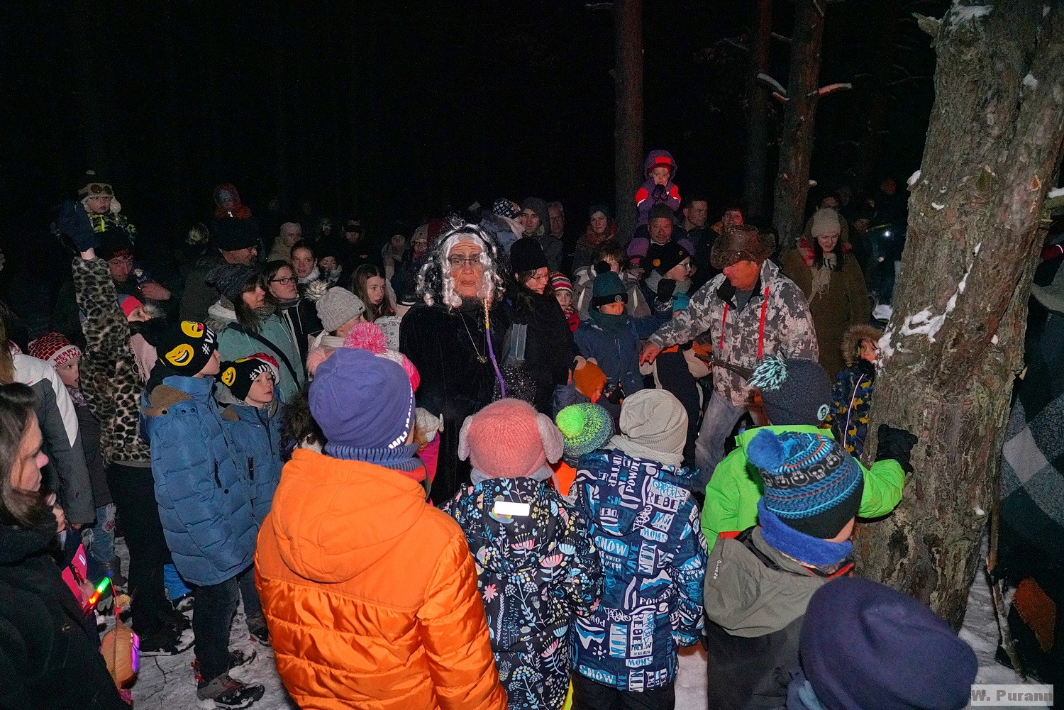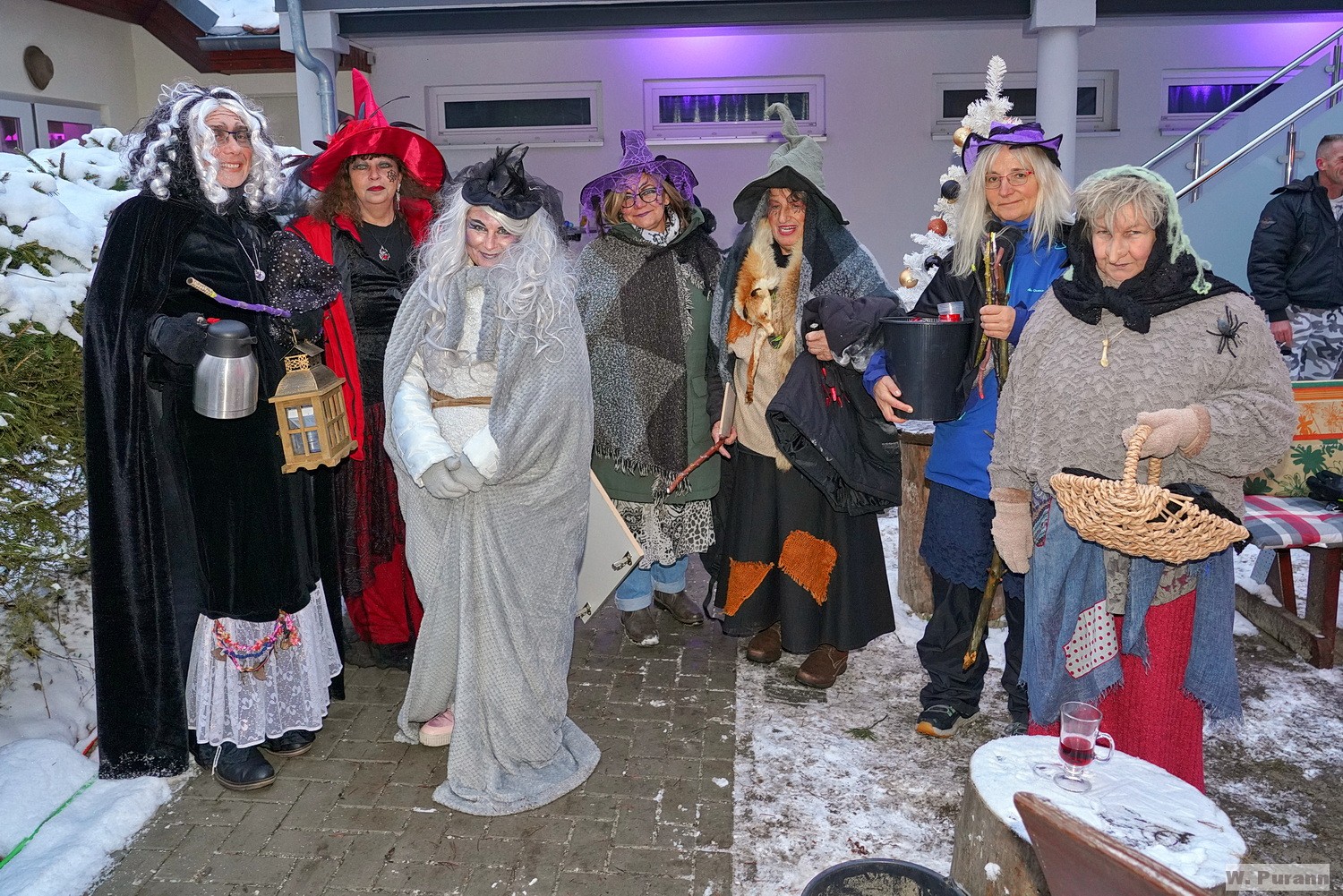 Erwachsenenschar ein Waldschrat und Hexen, die der Gruppe den Weg