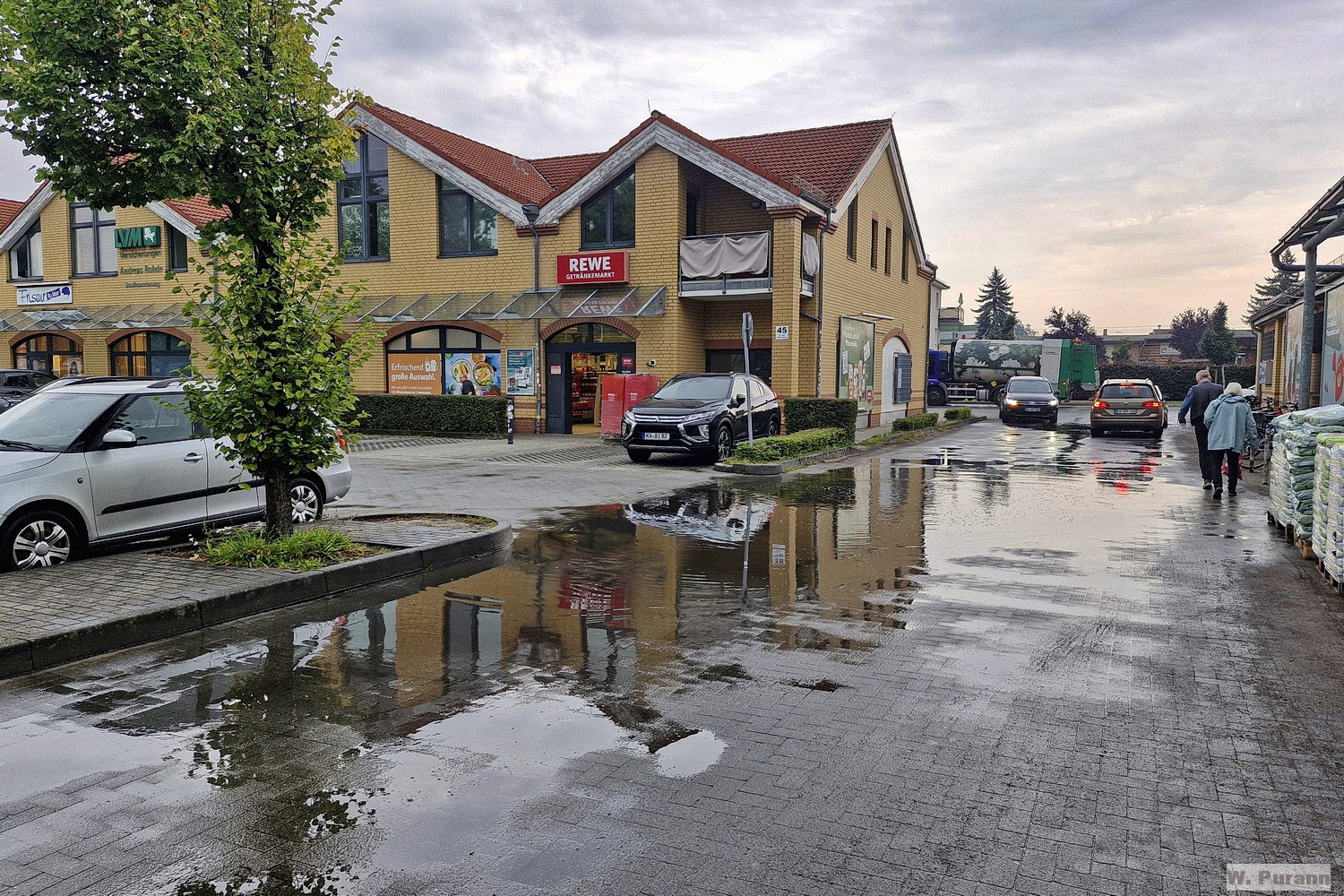 Überflutet war wieder mal der Parkplatz Hauptstraße/Motzener Straße bei REWE/Aldi.