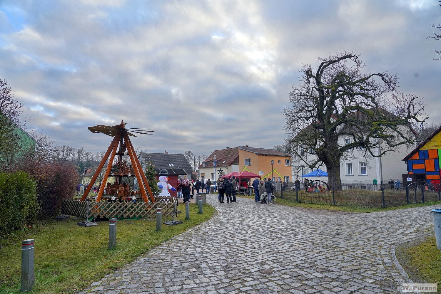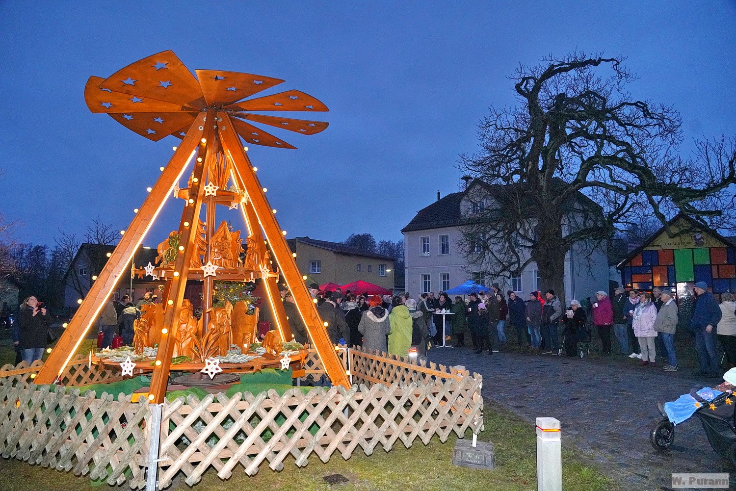 Tageszeit mit Lichtern strahlende Pyramide auf der Dorfaue gegenüber