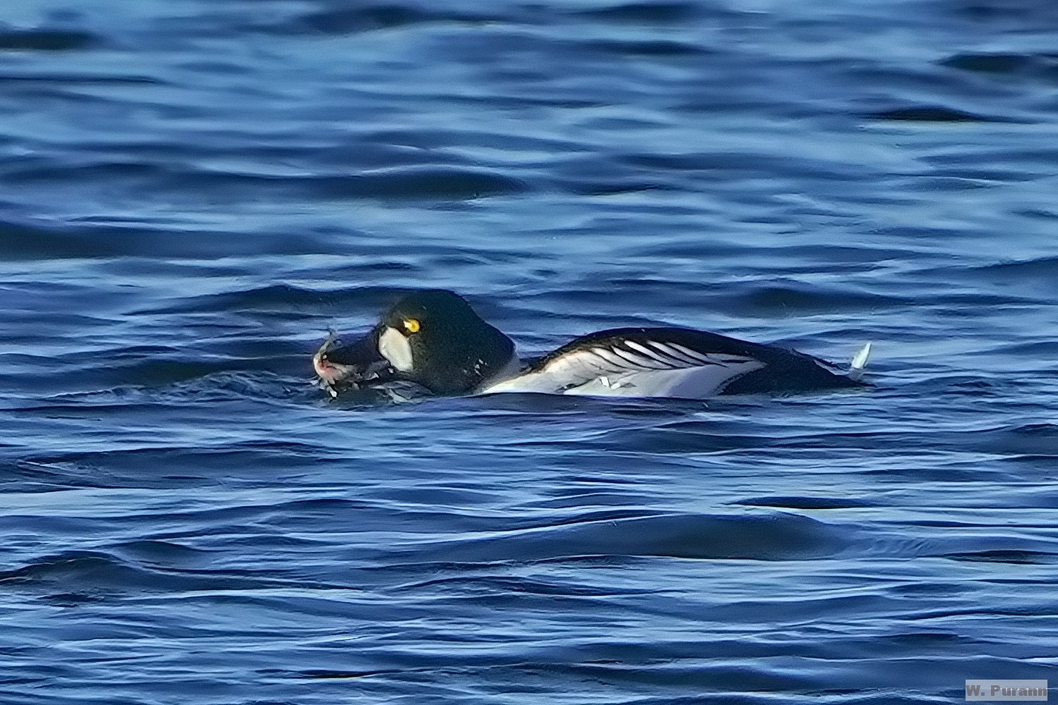 eine Schellente hatte Jagdglück und tauchte mit einem Fisch im Schnabel